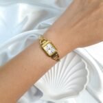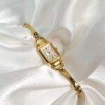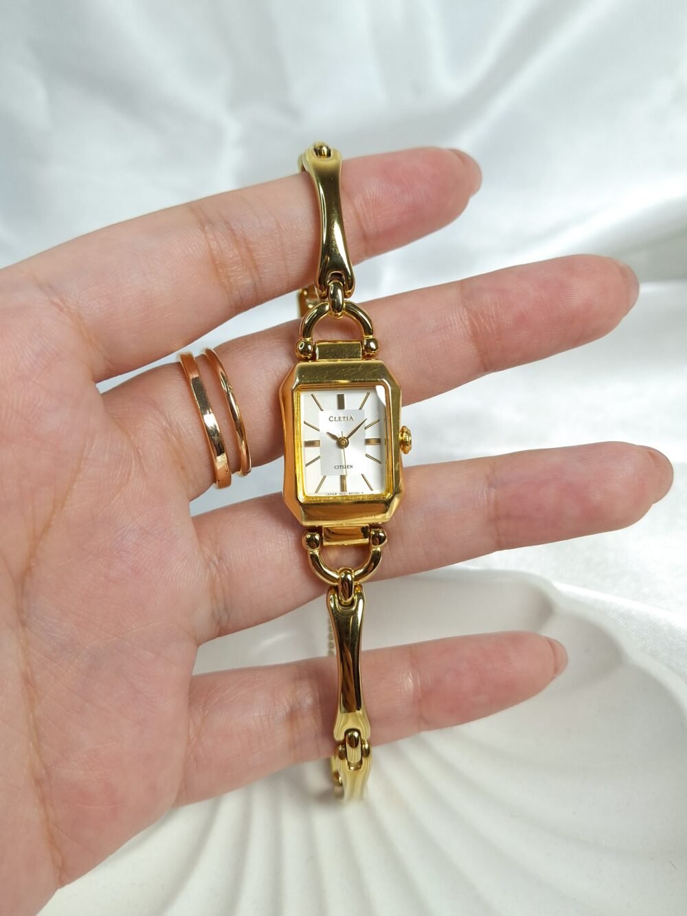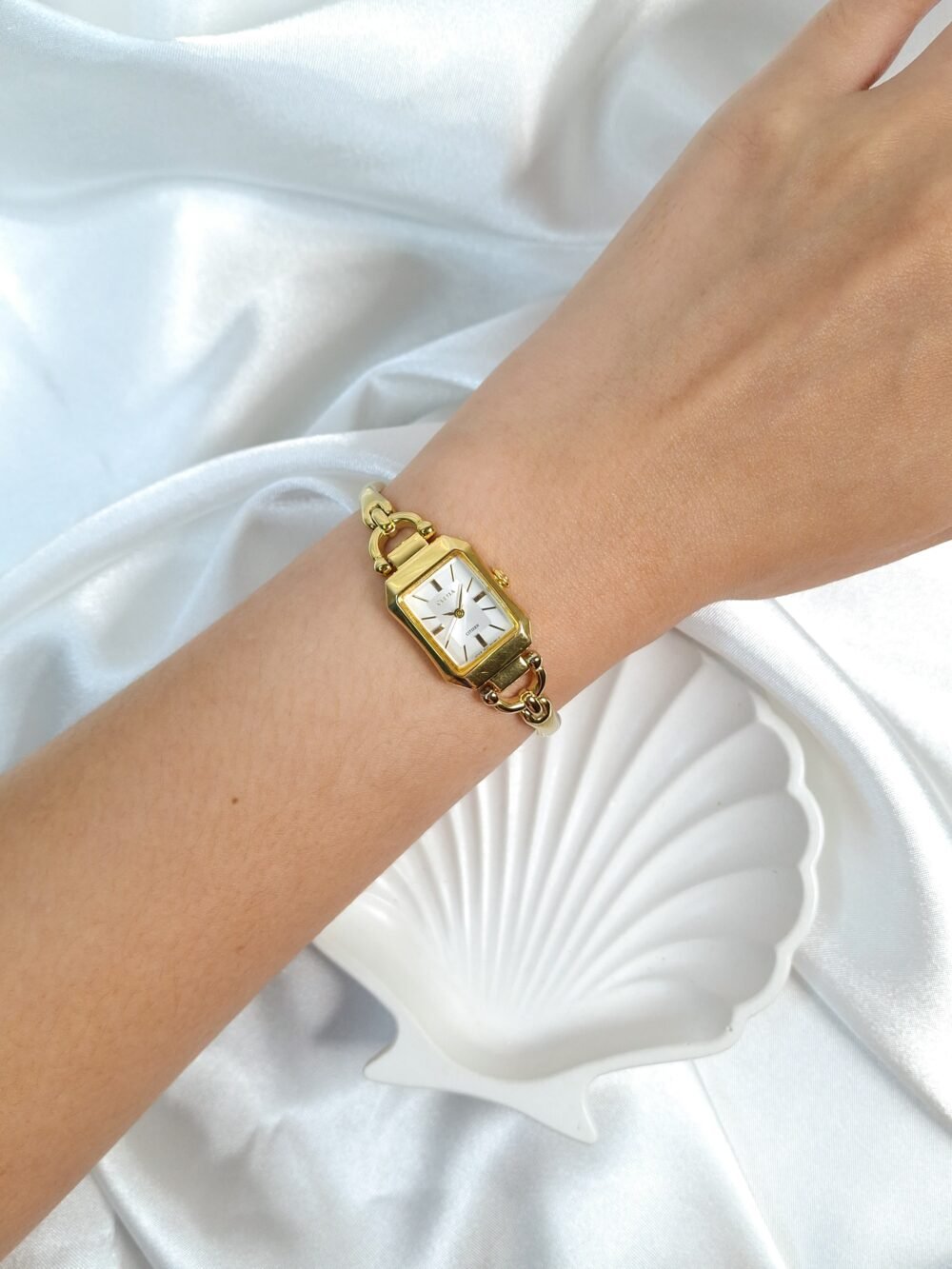 The Citizen Cletia Bangle Watch gracefully blends the timeless elegance of a fine bracelet with the precision of Japanese watchmaking. Its slender rectangular gold-tone case frames a luminous white dial with subtle layered textures, where sleek gold hands glide effortlessly over minimalist hour markers. Flowing seamlessly from case to wrist, the sculptural bangle-style bracelet—polished to a radiant sheen—creates the impression of a refined piece of jewelry rather than a traditional timepiece. Lightweight, sophisticated, and endlessly versatile, Cletia captures the essence of modern femininity in every golden detail.