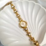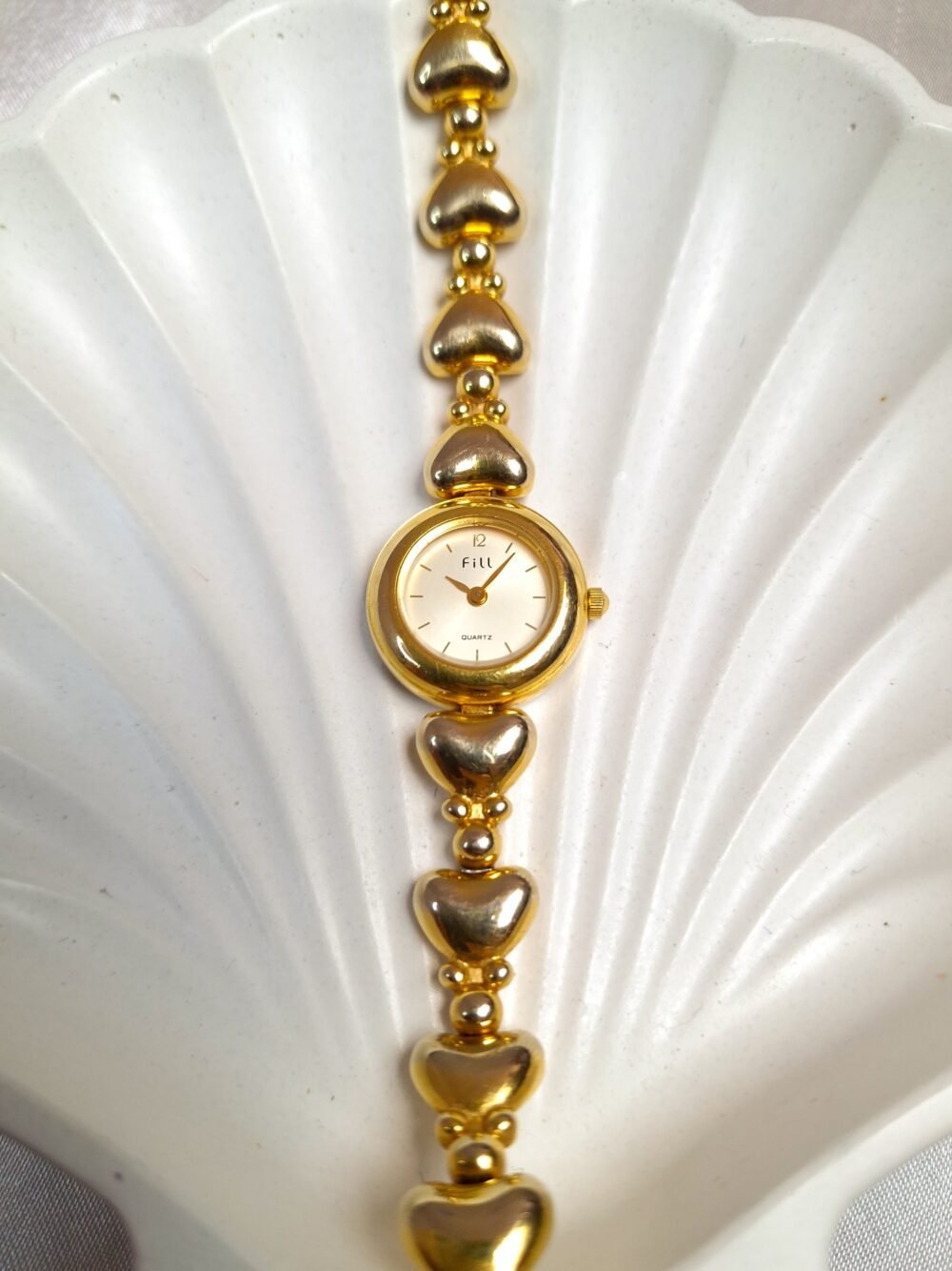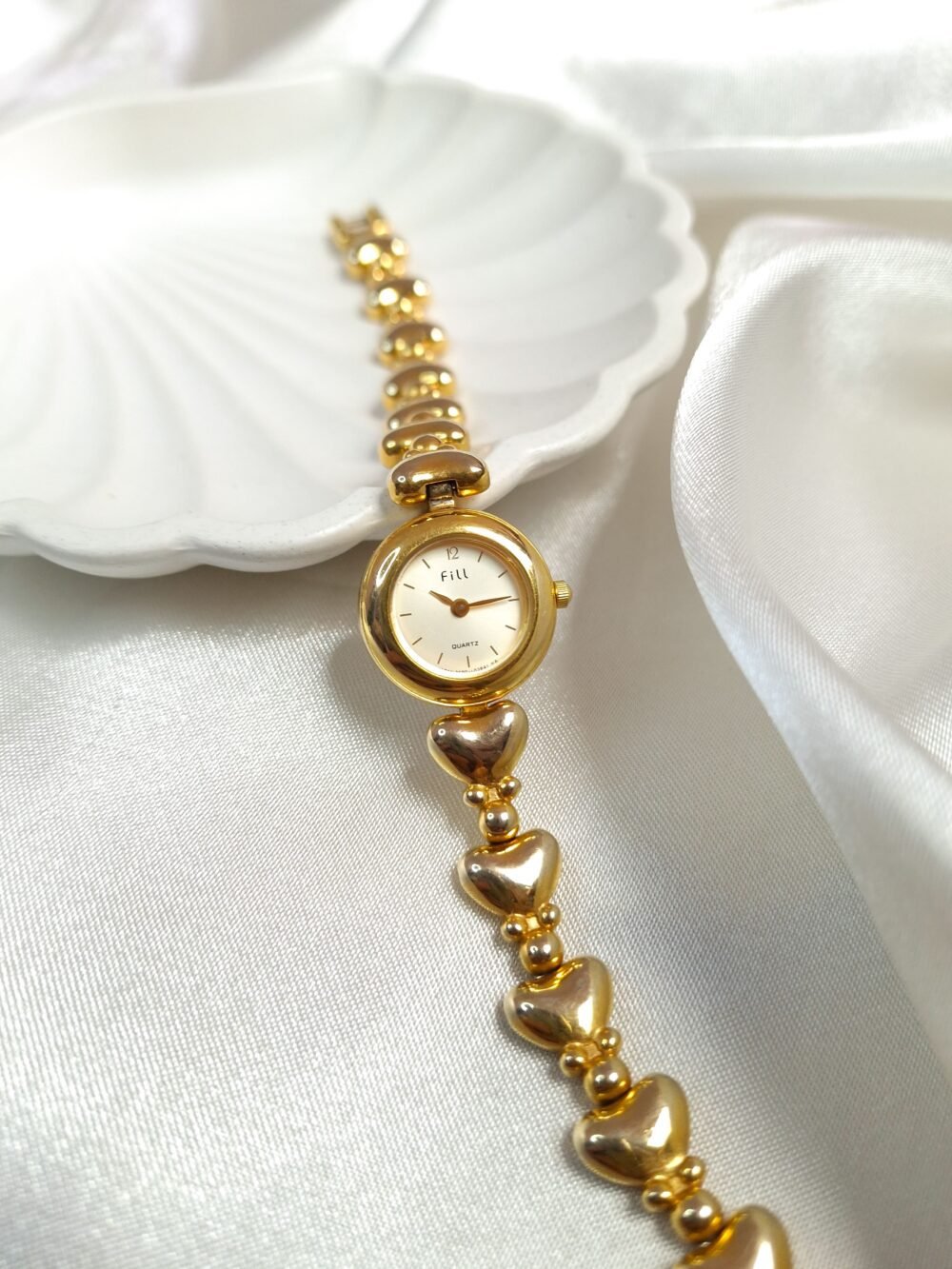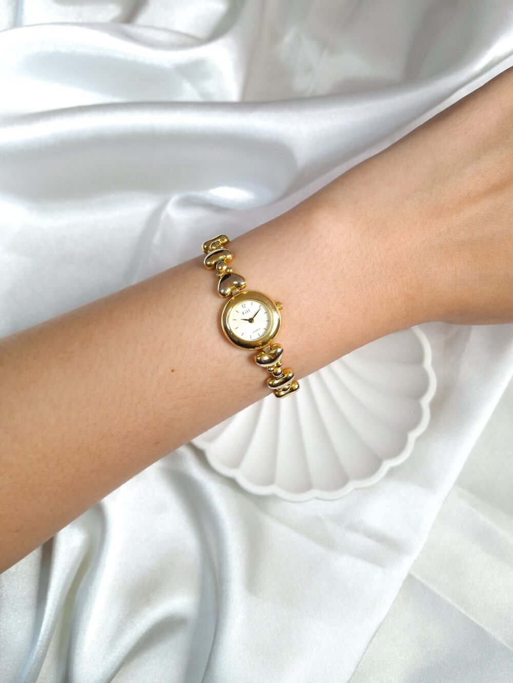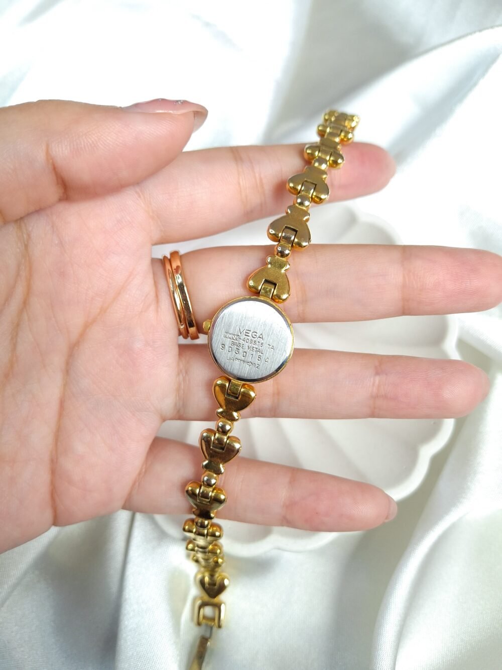 Refined and romantically styled, the Citizen Vega “Fill” is a rare 1990s ladies’ timepiece that fuses jewelry-inspired design with timeless elegance. Its sculpted gold-plated heart-link bracelet flows into a petite polished case framing a soft champagne dial marked by fine Roman numerals and an oval 12 o’clock index. Powered by a precise Japanese quartz movement, this piece captures the charm of vintage femininity—an understated luxury for collectors and everyday elegance alike.