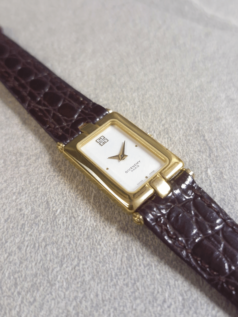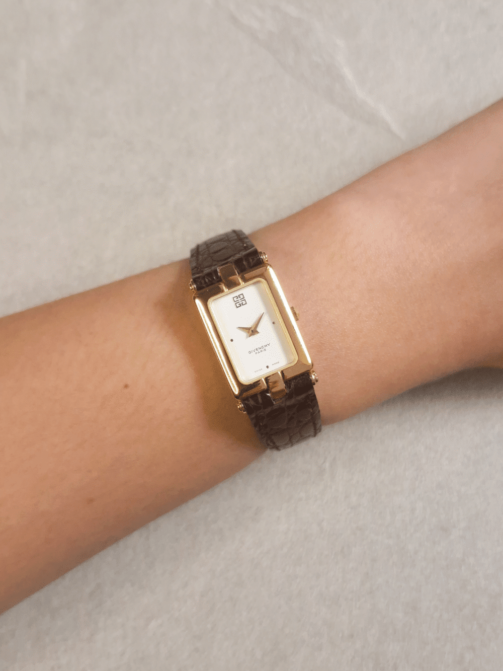 A quiet statement of Parisian elegance, this vintage Givenchy rectangular watch captures the essence of 1980s minimalism and couture refinement. Encased in warm gold plating with crisp architectural lines, it features a champagne-white dial free from numerals, adorned only with the iconic 4G Givenchy emblem and the understated “Givenchy Paris” signature. The slim gold hands sweep across its Swiss-made dial with grace, powered by a precise quartz movement nestled beneath a scratch-resistant crystal. Paired with a genuine croc-embossed leather strap and butterfly clasp, it wraps the wrist like a tailored accessory rather than a timepiece.