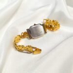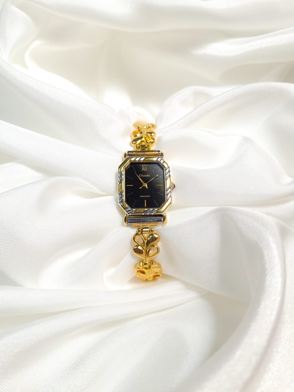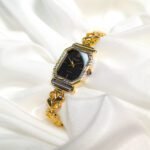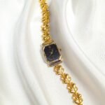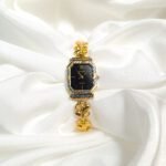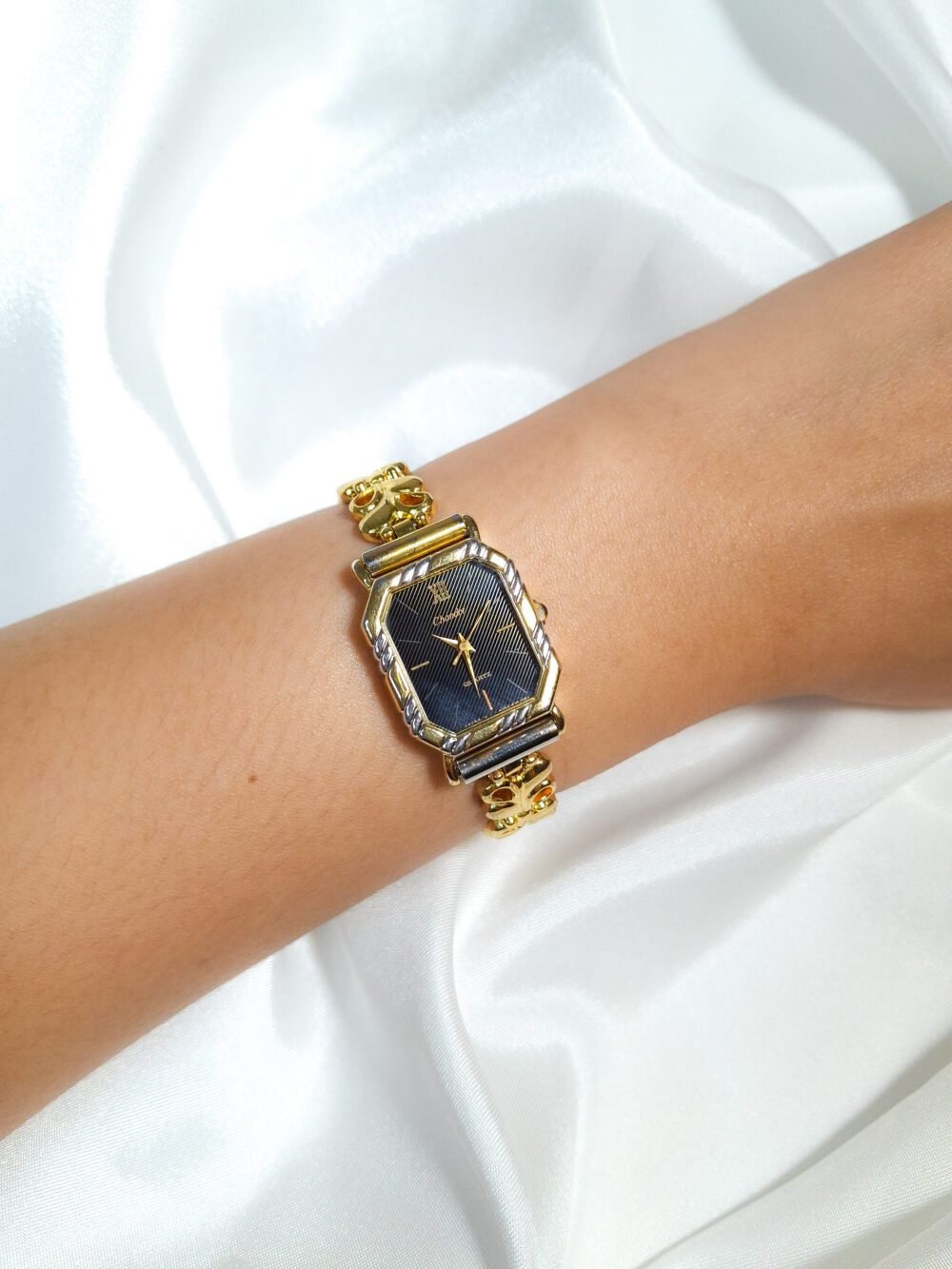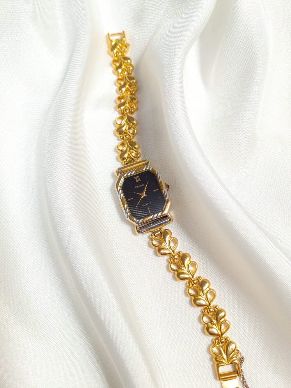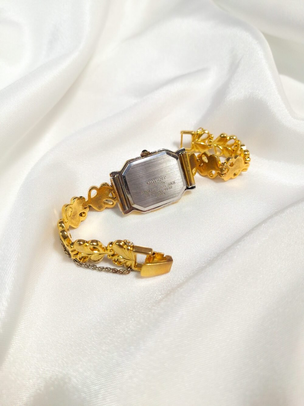 Orient Black & Gold watch with a sophisticated leaf-link bracelet. Featuring a sleek black dial accented by gold markers and a unique two-tone case, this timepiece blends classic elegance with modern design—perfect for any occasion.