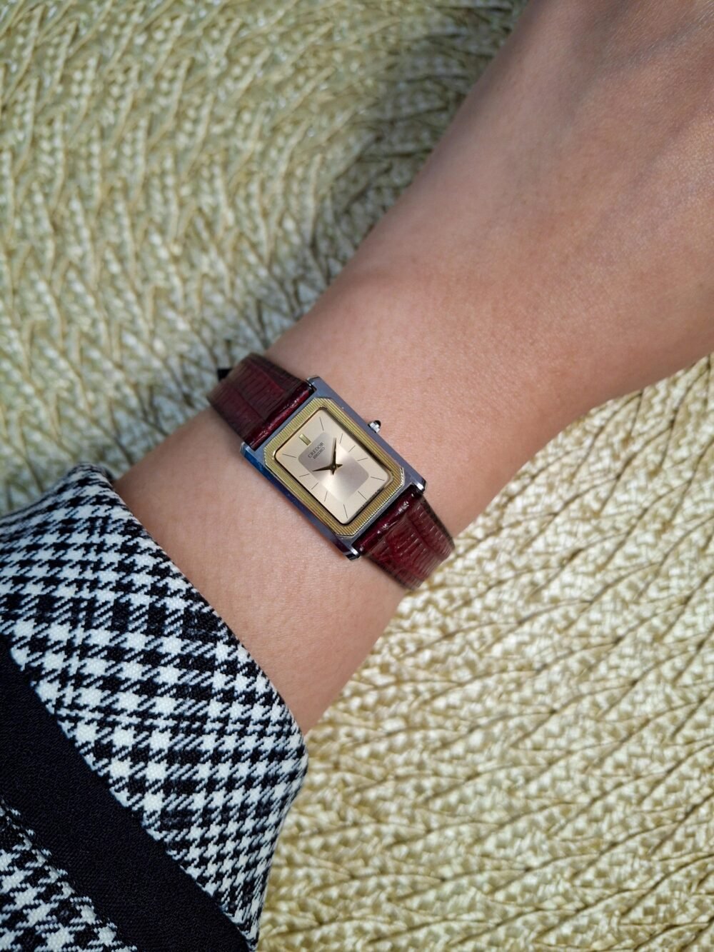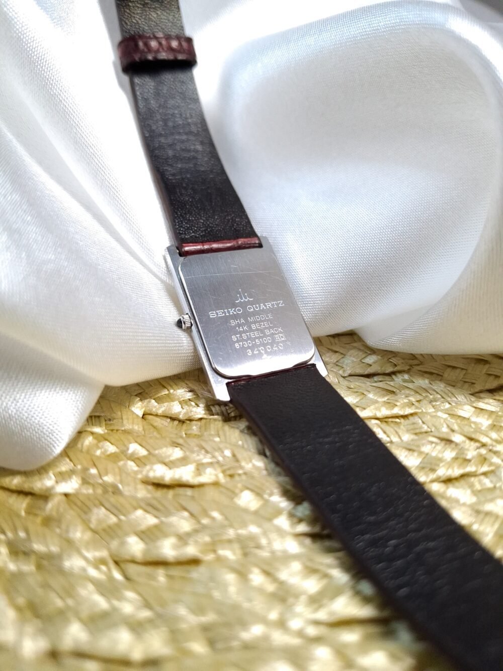 The Seiko Credor 6730-5100 is a vintage women’s dress watch that exemplifies Japanese craftsmanship and elegance. Its dual-tone case, combining Silver Hard Alloy and a 14K solid gold bezel, creates a refined aesthetic. The champagne dial, protected by a sapphire crystal, features gold dauphine hands and stick markers, ensuring legibility and style. Powered by the Seiko Caliber 6730 quartz movement, it offers precise timekeeping. With dimensions of approximately 18mm x 27mm, this watch is an ideal accessory for formal occasions, embodying subtle luxury and timeless design.
