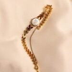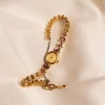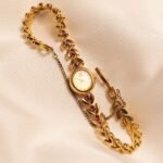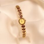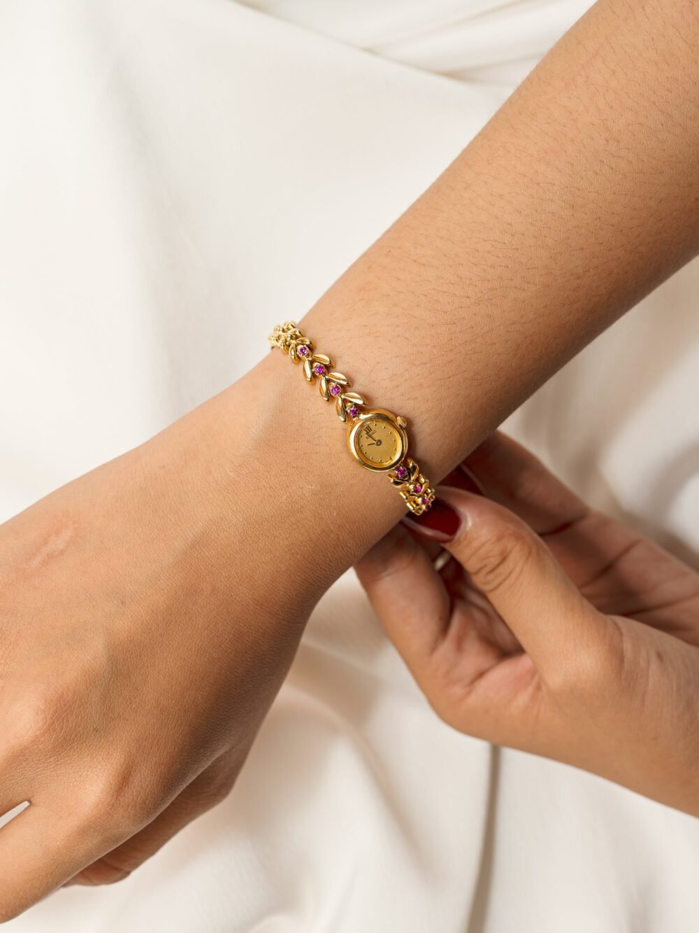 Discover understated luxury in the form of this Seiko Gold Leaf Ruby-Accent Ladies Bracelet Watch. Its slender bracelet, fashioned from delicate gold-tone leaf-like links, embraces the wrist with graceful fluidity. Nestled within is a petite oval case, softly glowing in warm gold, and adorned with ruby-red accents that echo the petals of a blooming rose. The minimalist dial, marked only by a Roman “XII” and tiny dot markers, evokes classic femininity with a whisper of vintage allure.