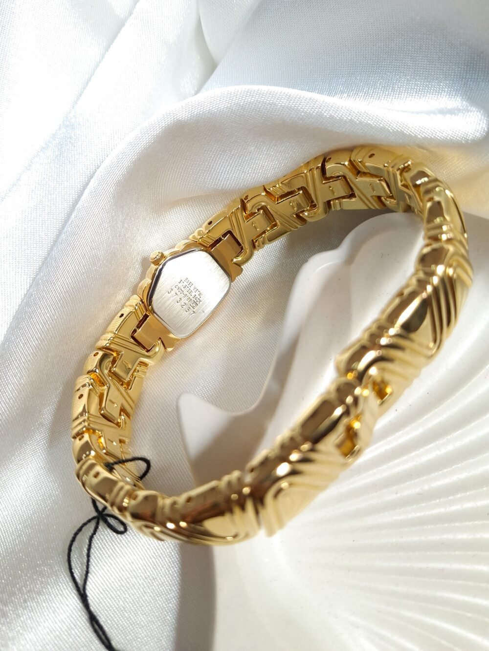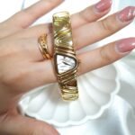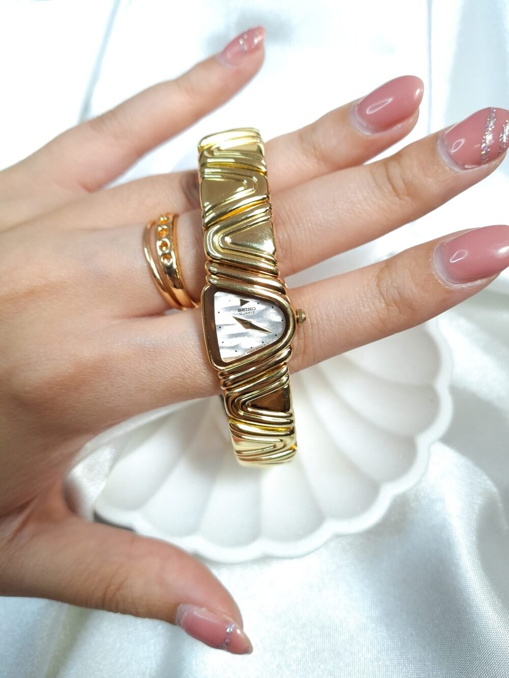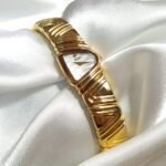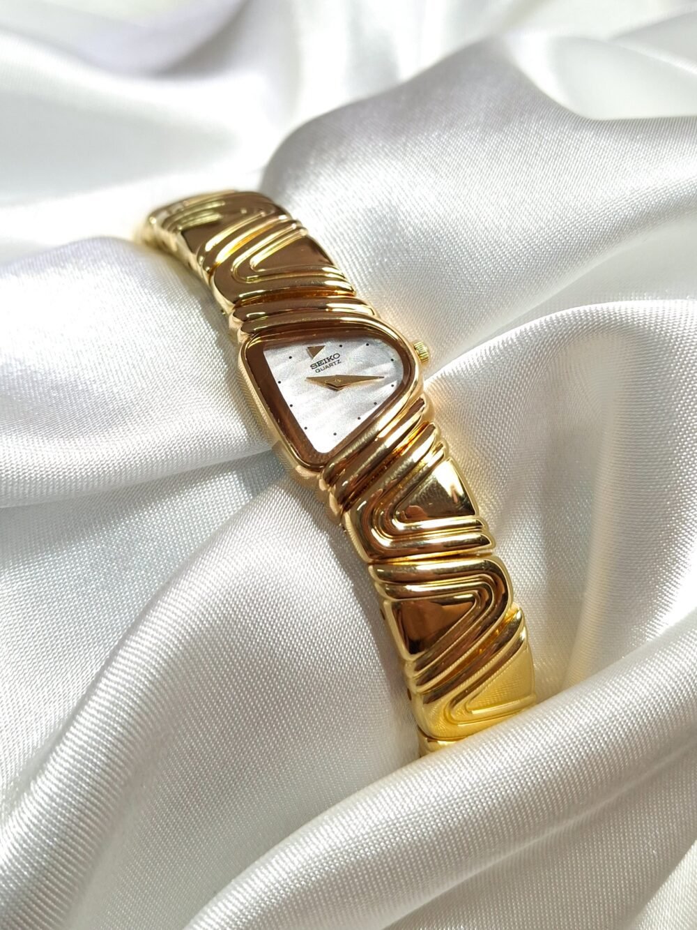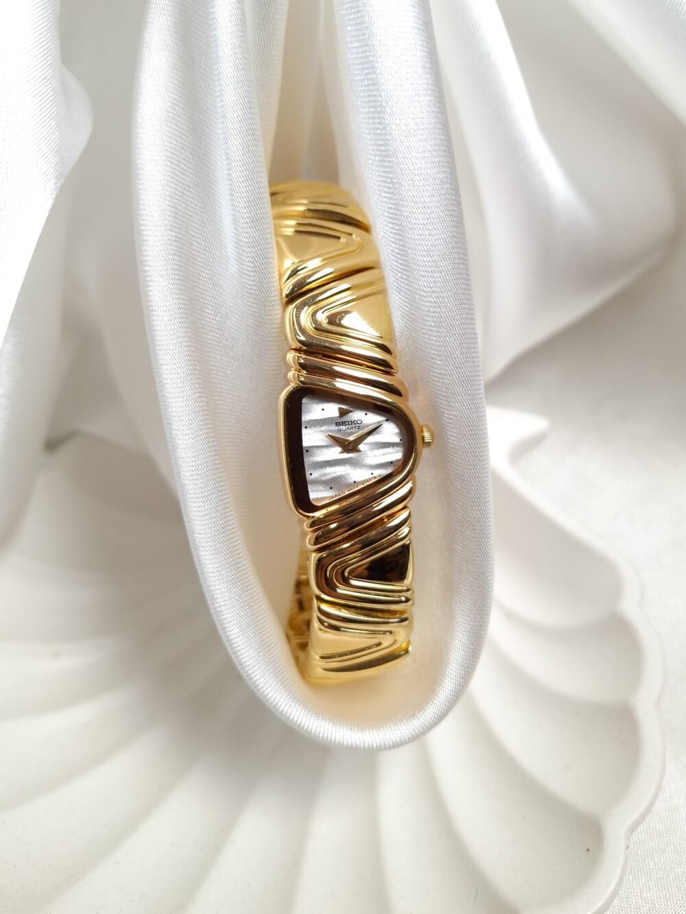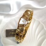 A poetic reinterpretation of Seiko’s asymmetrical design heritage, the Seiko 4N00-3740—endearingly known as the “Halfmoon Piano”—captures the essence of sculptural timekeeping with a refined, avant-garde spirit. Drawing inspiration from the now-iconic Halfmoon series that defined Seiko’s bold 1990s experimentation, this piece mesmerizes through its undulating gold-tone bracelet that echoes the lyrical flow of piano keys. Its gently arched case cradles a luminous mother-of-pearl dial, offering a visual symphony of texture, light, and movement. More than a watch, it is a statement of quiet opulence—an objet d’art for the wrist that speaks to those who value rarity, grace, and timeless expression.