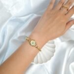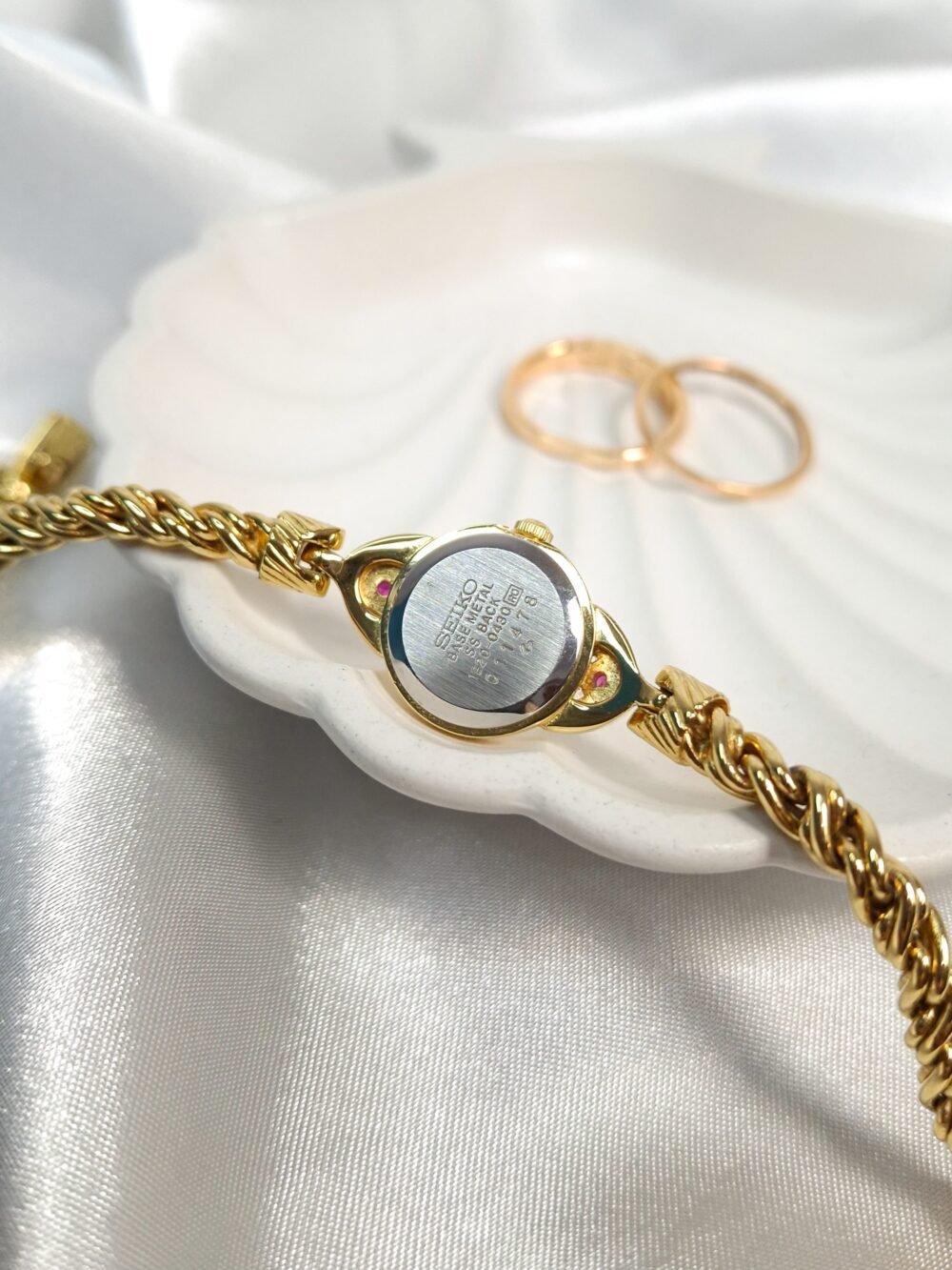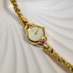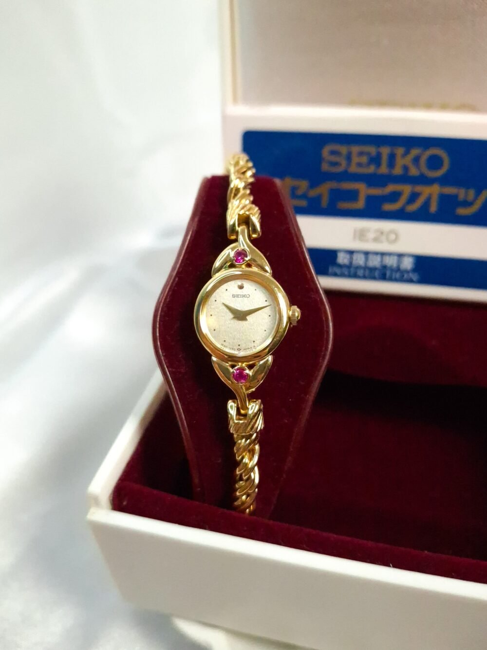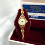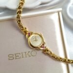 Timeless sophistication meets graceful design in this exquisite Seiko Regal Ruby timepiece. Crafted in a radiant gold-tone finish, the watch features a delicate round case adorned with two brilliant pink gemstones—subtle yet striking touches that elevate its feminine charm. Its champagne-textured dial is minimalist and refined, marked only with fine dot hour markers and slim gold hands. Paired with a beautifully twisted bracelet that drapes the wrist like fine jewelry, this watch is a seamless blend of elegance and wearability. Powered by Seiko’s trusted quartz movement, it offers reliable precision wrapped in vintage allure. Whether you’re dressing up for an occasion or adding a hint of classic luxury to your daily look, this rare Seiko 1E20-0430 model is a collectible accessory that speaks volumes of timeless beauty.