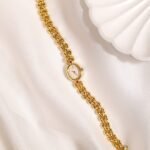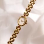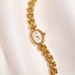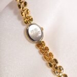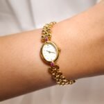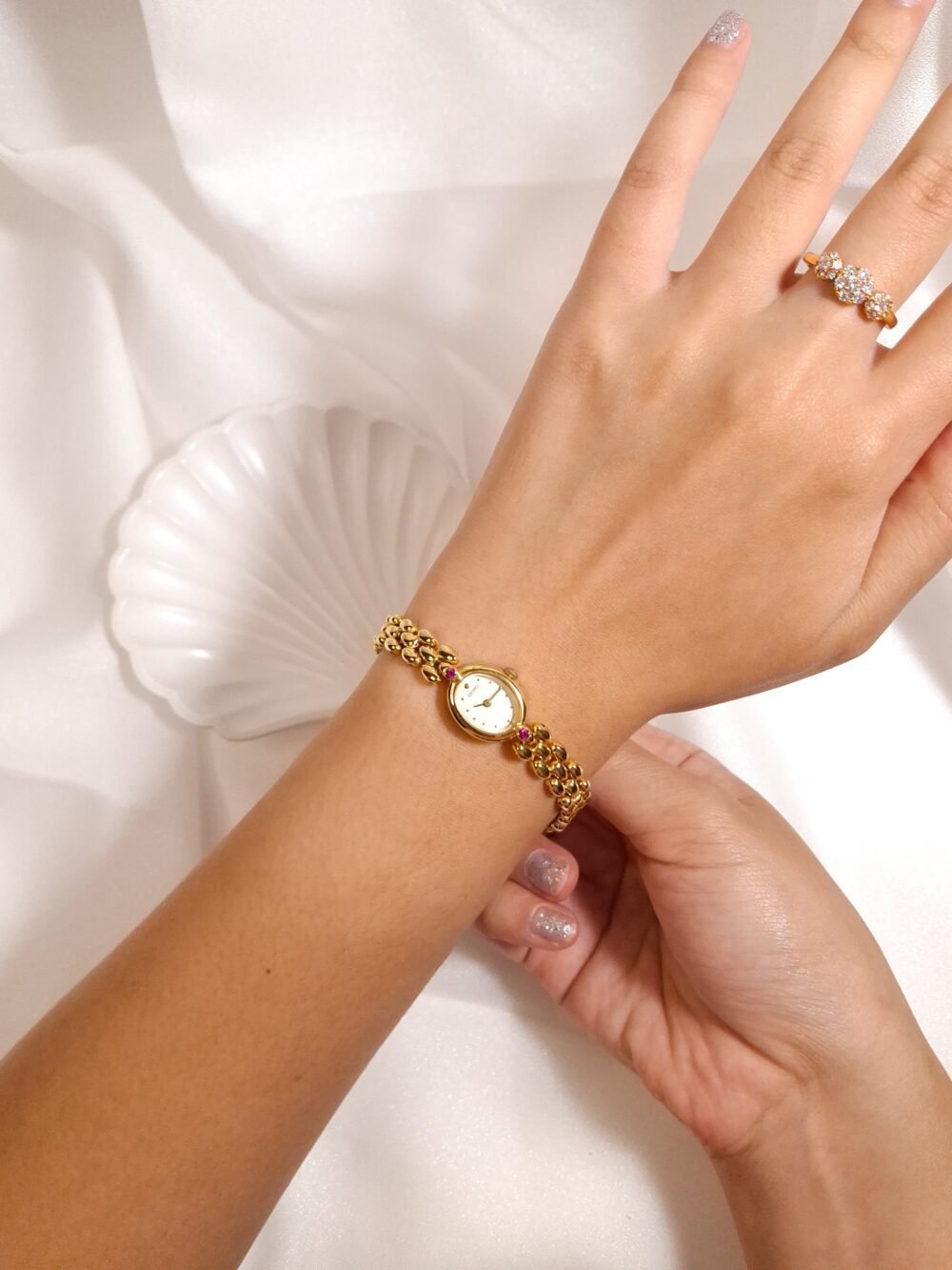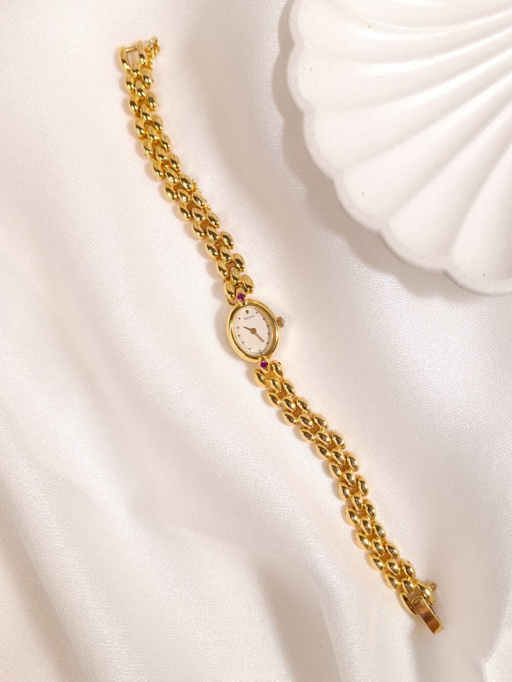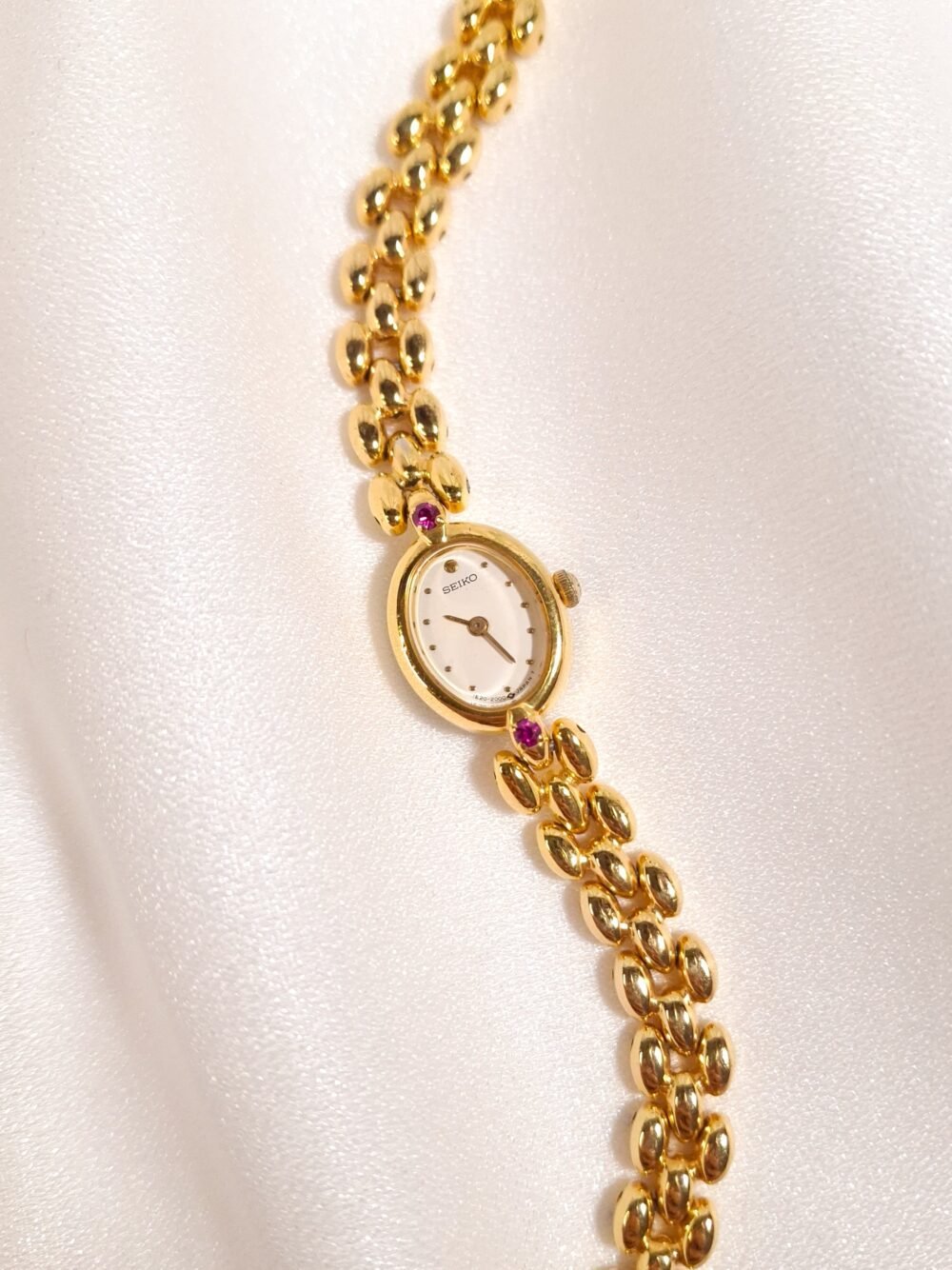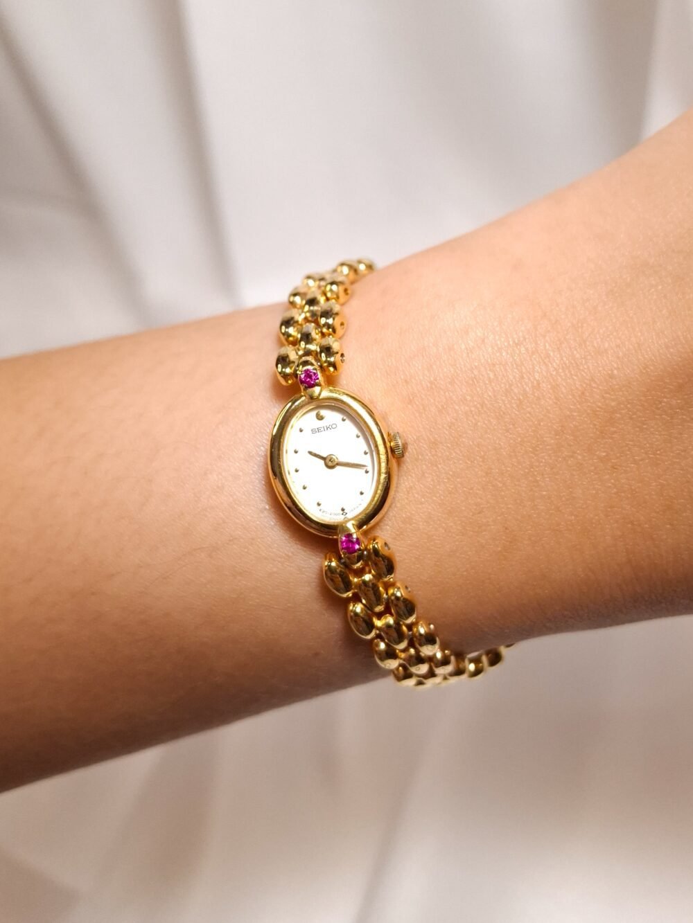 A petite spark of gold and light, this vintage Seiko Ruby Accent Oval Bracelet Watch feels more like fine jewelry than a simple timekeeper. The tiny oval case in warm gold tone frames a clean white dial with minimalist dot markers and slim dauphine hands, creating a soft and feminine look on the wrist. At the north and south of the case sit two pink ruby-coloured stones that add a playful pop of colour and quietly catch the light as you move. Paired with a sculpted three-row bead bracelet in matching gold tone, the whole piece drapes gracefully against the skin and instantly dresses up any outfit.