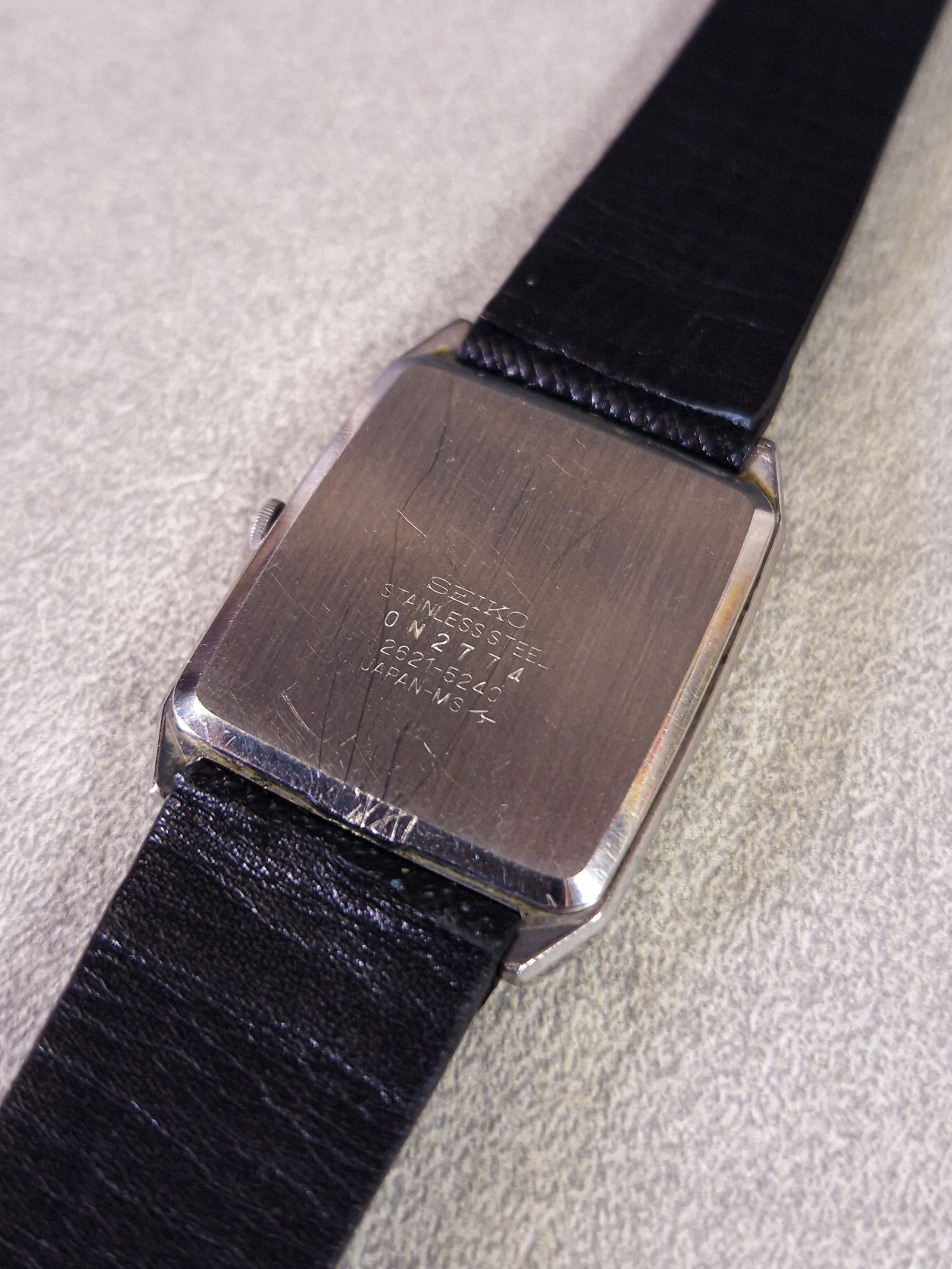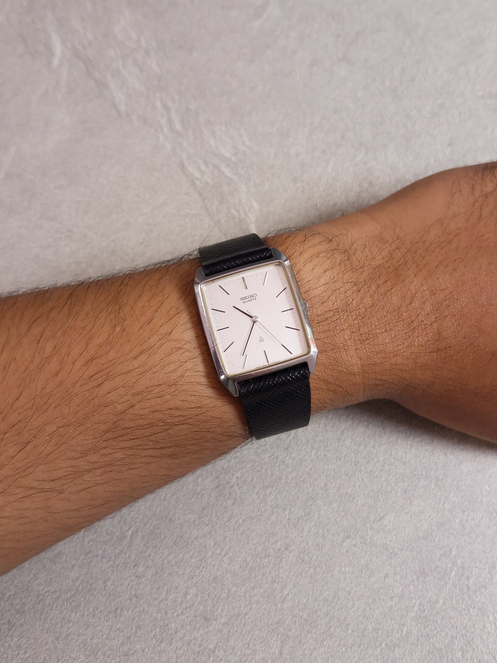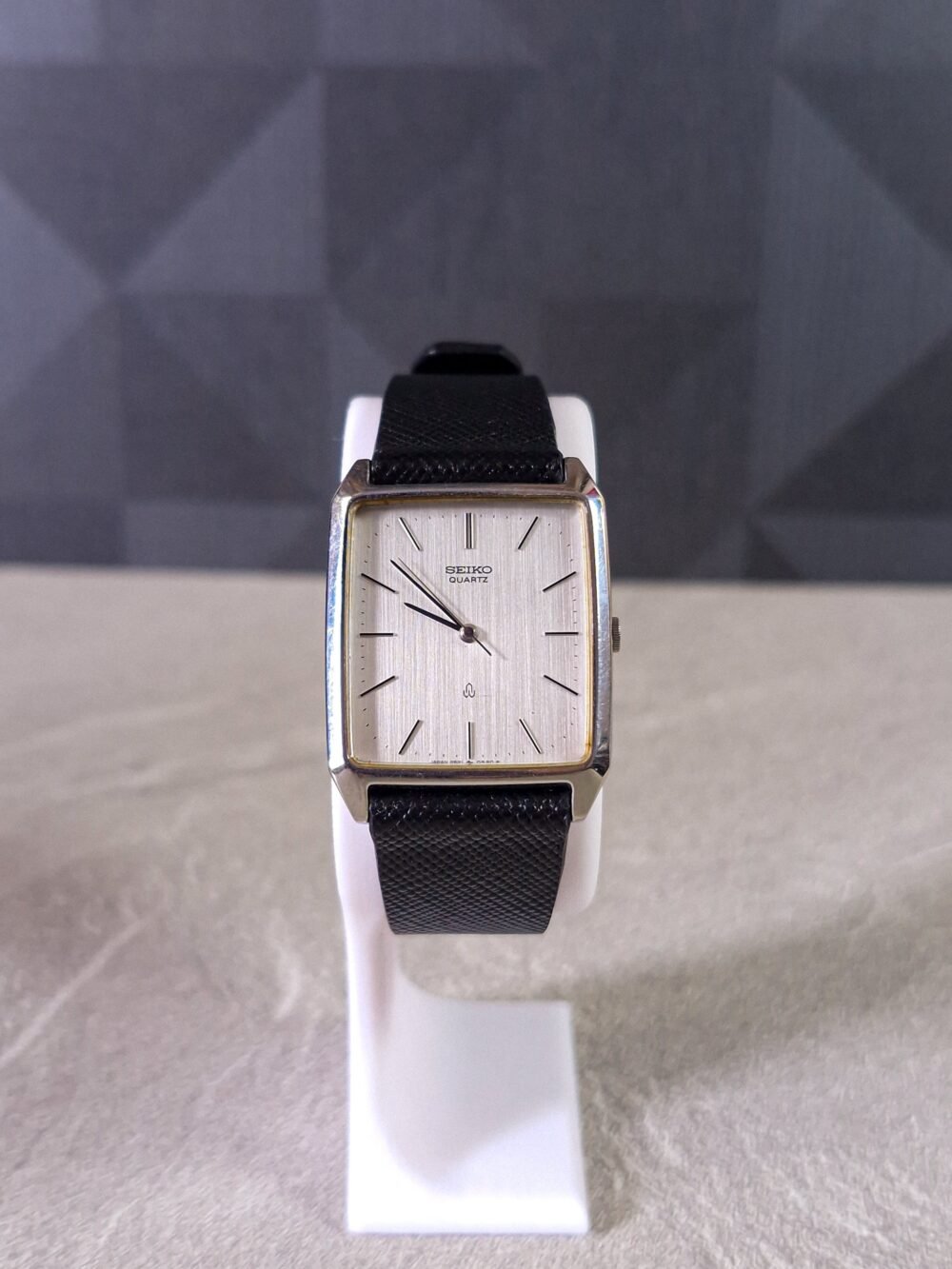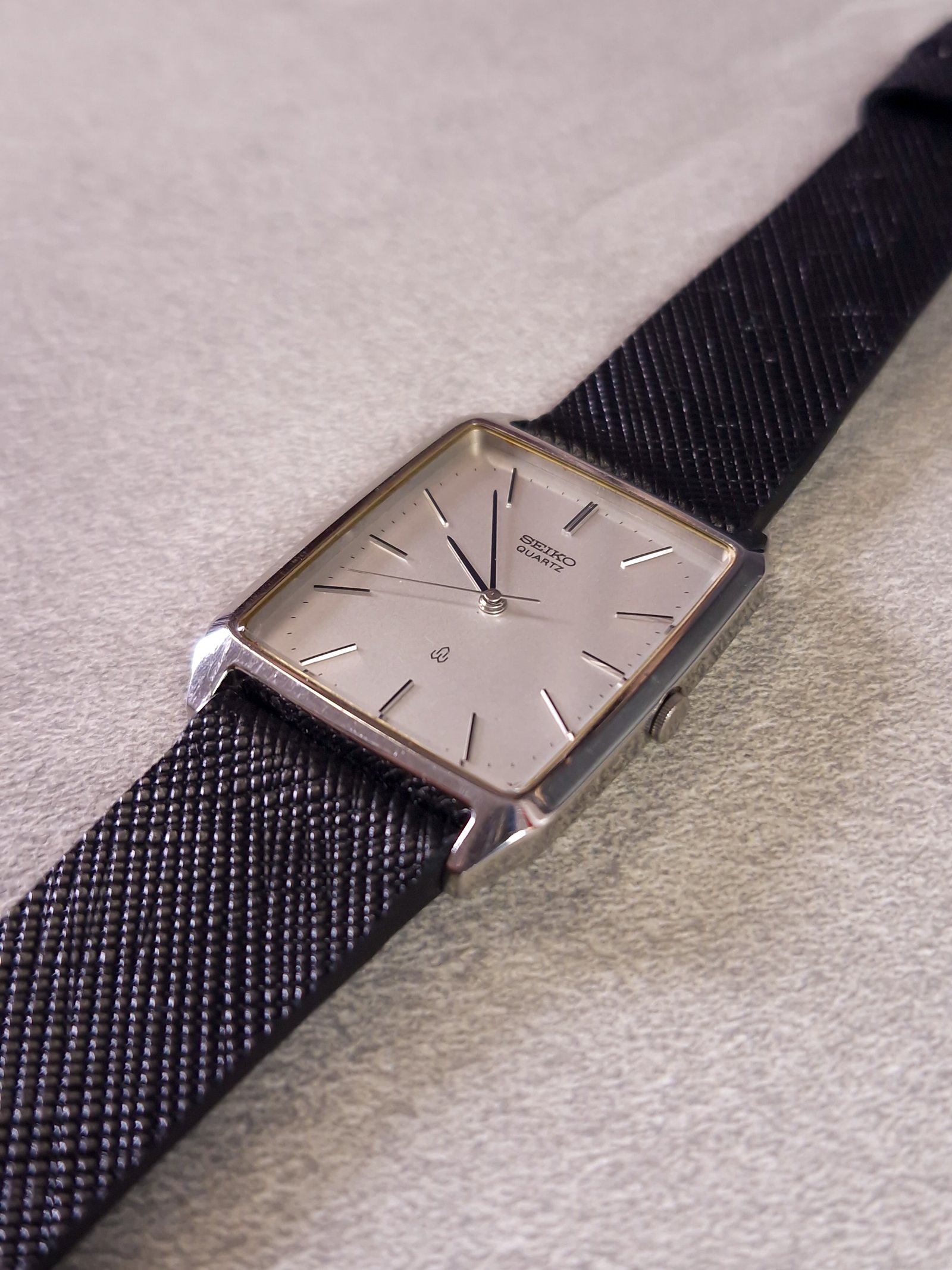 The Seiko 2621‑5240 is a refined vintage quartz dress watch from Seiko’s Daini factory, driven by the precise 2621A movement (32,768 Hz, 2 jewels, hacking, ±15 s/month). It features clean lines and a polished rectangular bezel that perfectly frames the warm gold-toned linen-textured dial, complemented by slim baton hands and markers.