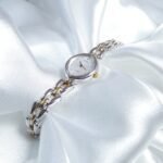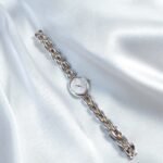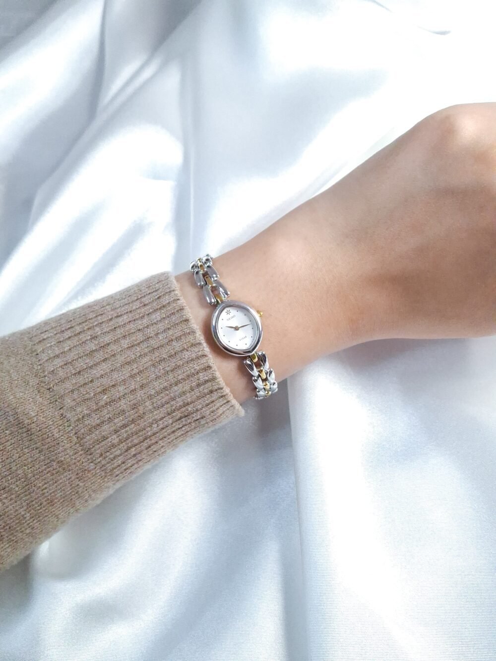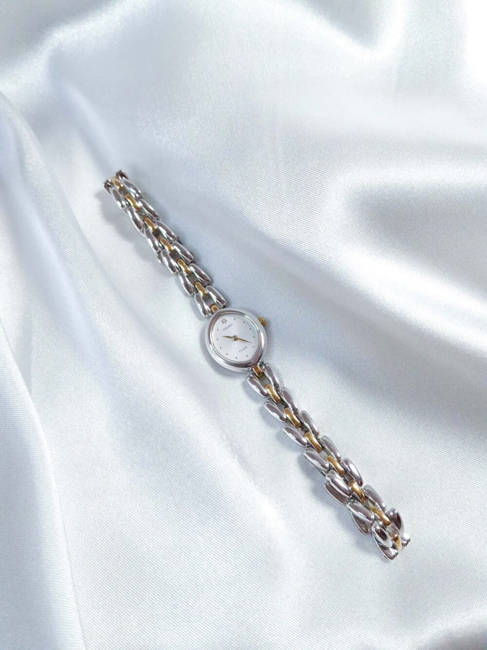 Timeless Seiko Tisse from the 1980s, designed with the spirit of wearable elegance in mind — blending the function of a watch with the charm of jewelry. This dainty two-tone piece features a petite round case, a clean white dial, and a graceful link bracelet in silver and gold tones. Decades later, its delicate style still feels effortlessly modern.