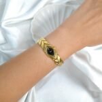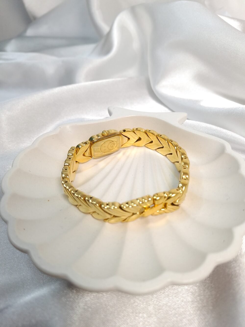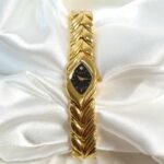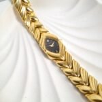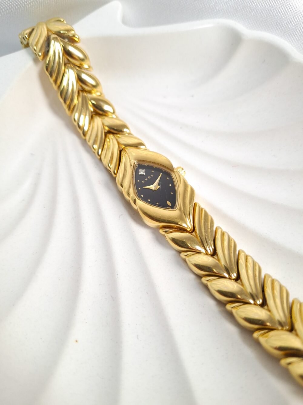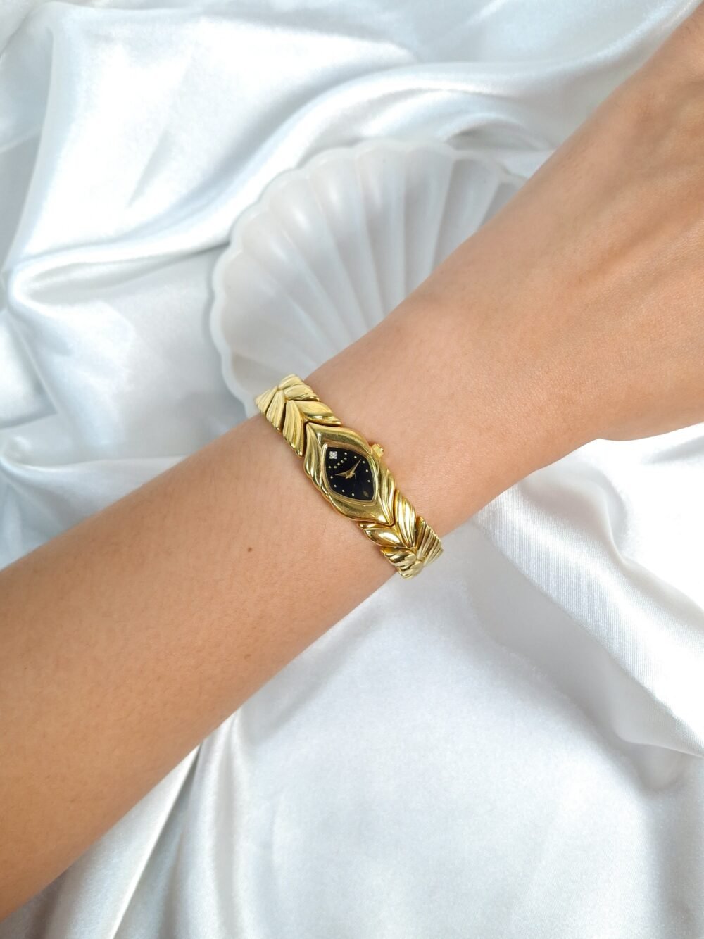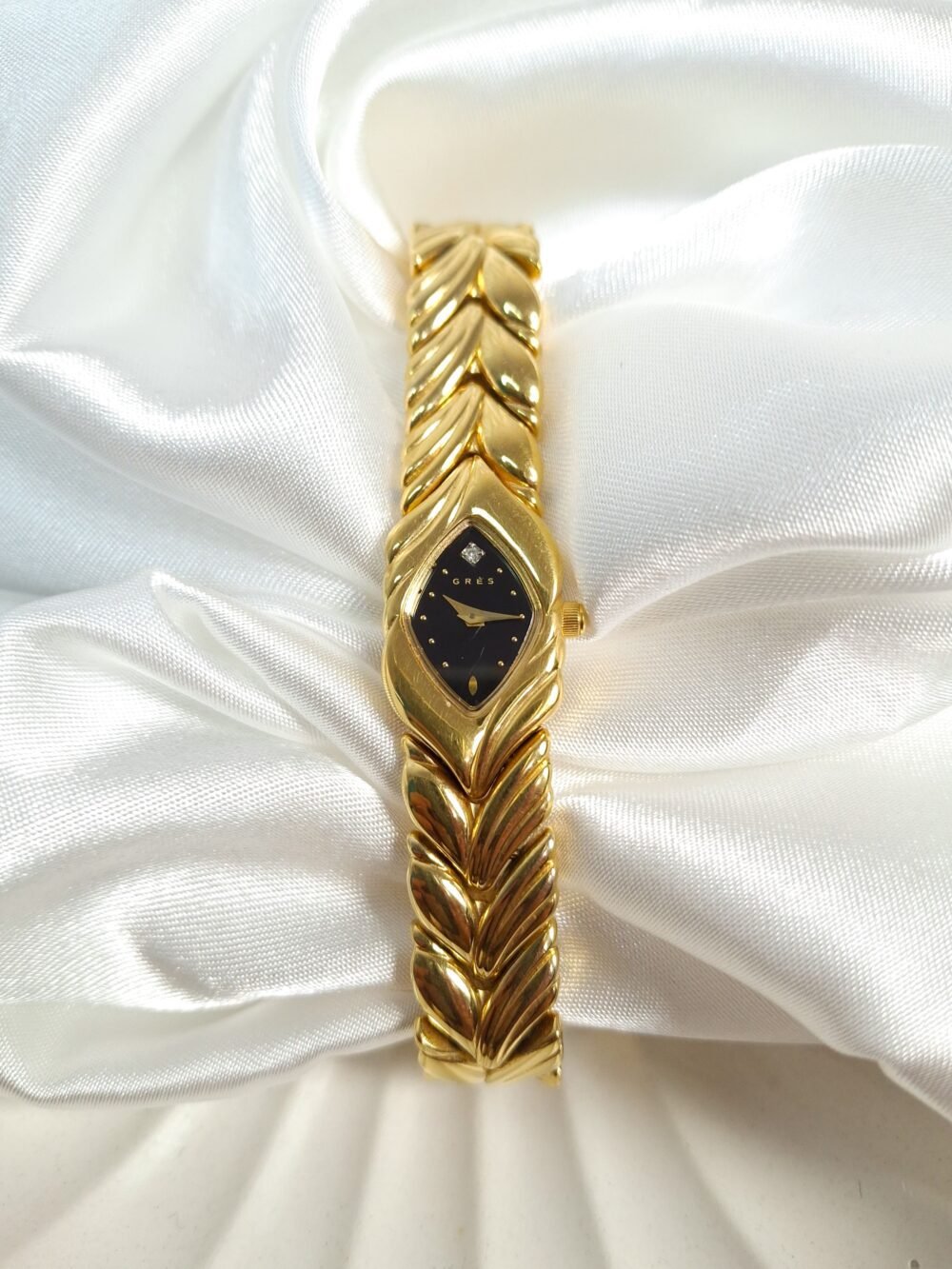 Step into timeless Parisian elegance with this rare vintage Grès Paris ladies watch. Featuring a sculpted gold-tone case with a distinctive teardrop dial in deep black, this timepiece exudes understated sophistication. The bold, leaf-shaped bracelet links create a seamless flow of artistry and luxury, reminiscent of the brand’s haute couture heritage. Perfect for collectors or those who appreciate refined vintage design, this watch is more than an accessory — it’s a statement of grace and enduring beauty.